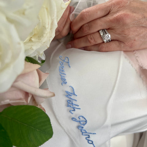 Handmade tulle bridal gloves available with a custom embroidered sentiment.